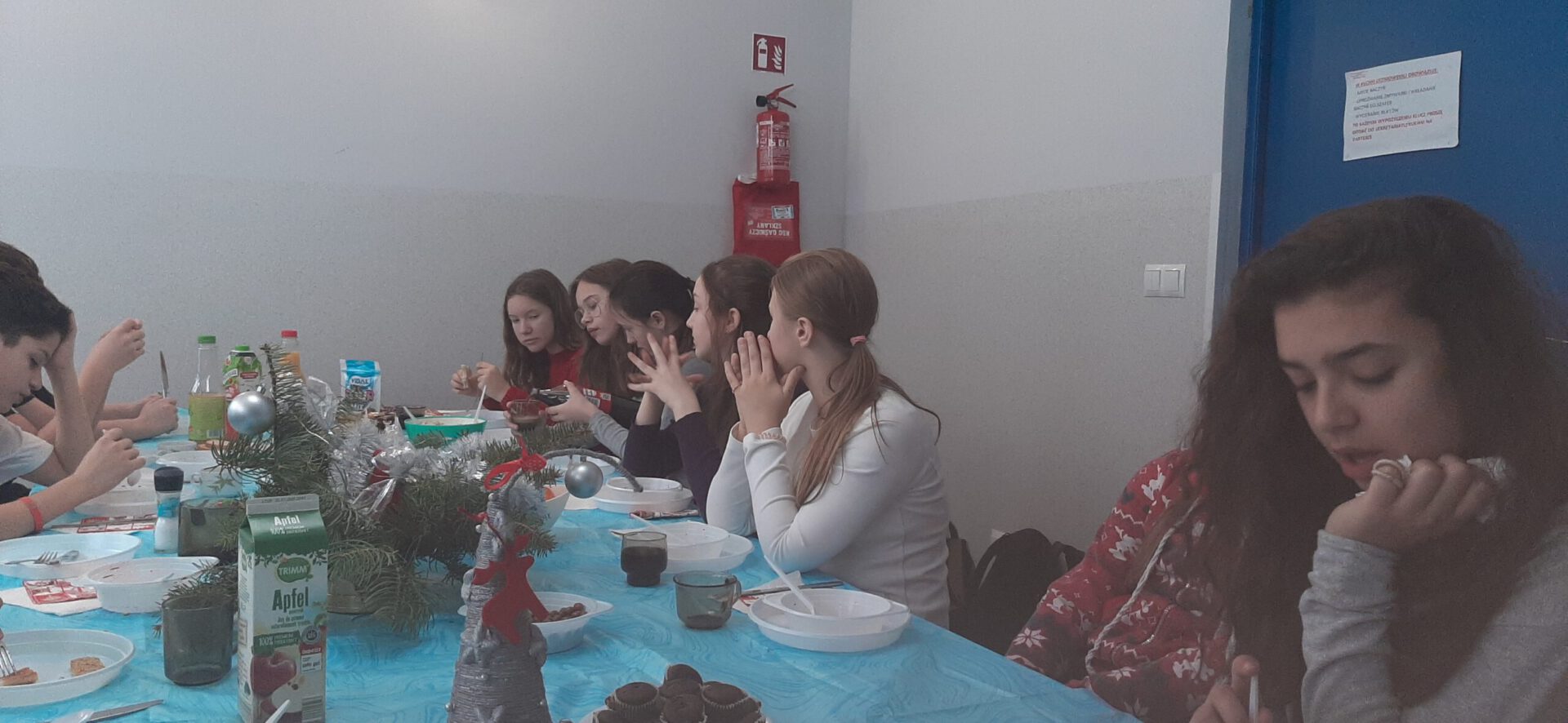 Klasowa wigilia w 7a była wesoła, smaczna i kolorowa. Były życzenia I świąteczne piosenki.