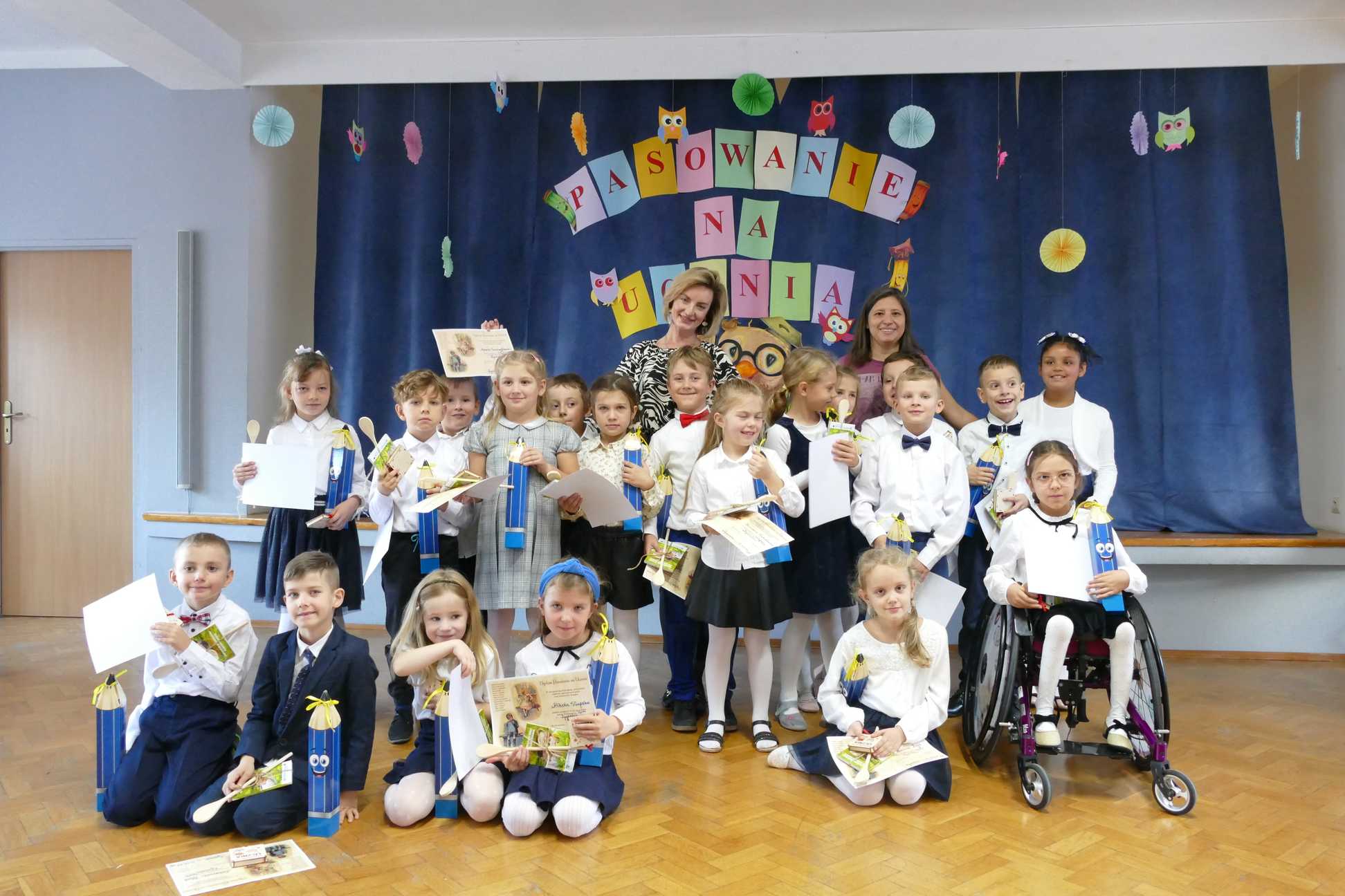 11 października 2022 r. odbyła się w naszej szkole uroczystość pasowania na ucznia. Jest to szczególny dzień, który na długo pozostanie w pamięci każdego ucznia klasy pierwszej. W tym dniu dzieci oficjalnie przyjęte zostały do grona uczniów szkoły podstawowej. Podczas uroczystości pierwszoklasiści pokazali, że potrafią pięknie śpiewać, recytować wiersze i tańczyć. Najważniejszą częścią uroczystości, na którą wszyscy czekali było uroczyste pasowanie uczniów wielkim ołówkiem oraz wręczenie pamiątkowych dyplomów i niespodzianek. Wszystkim pierwszoklasistom w tak ważnym dla nich dniu życzymy wielu sukcesów na nowej drodze obowiązków szkolnych