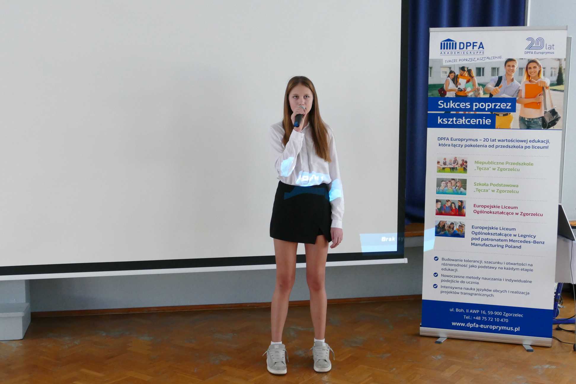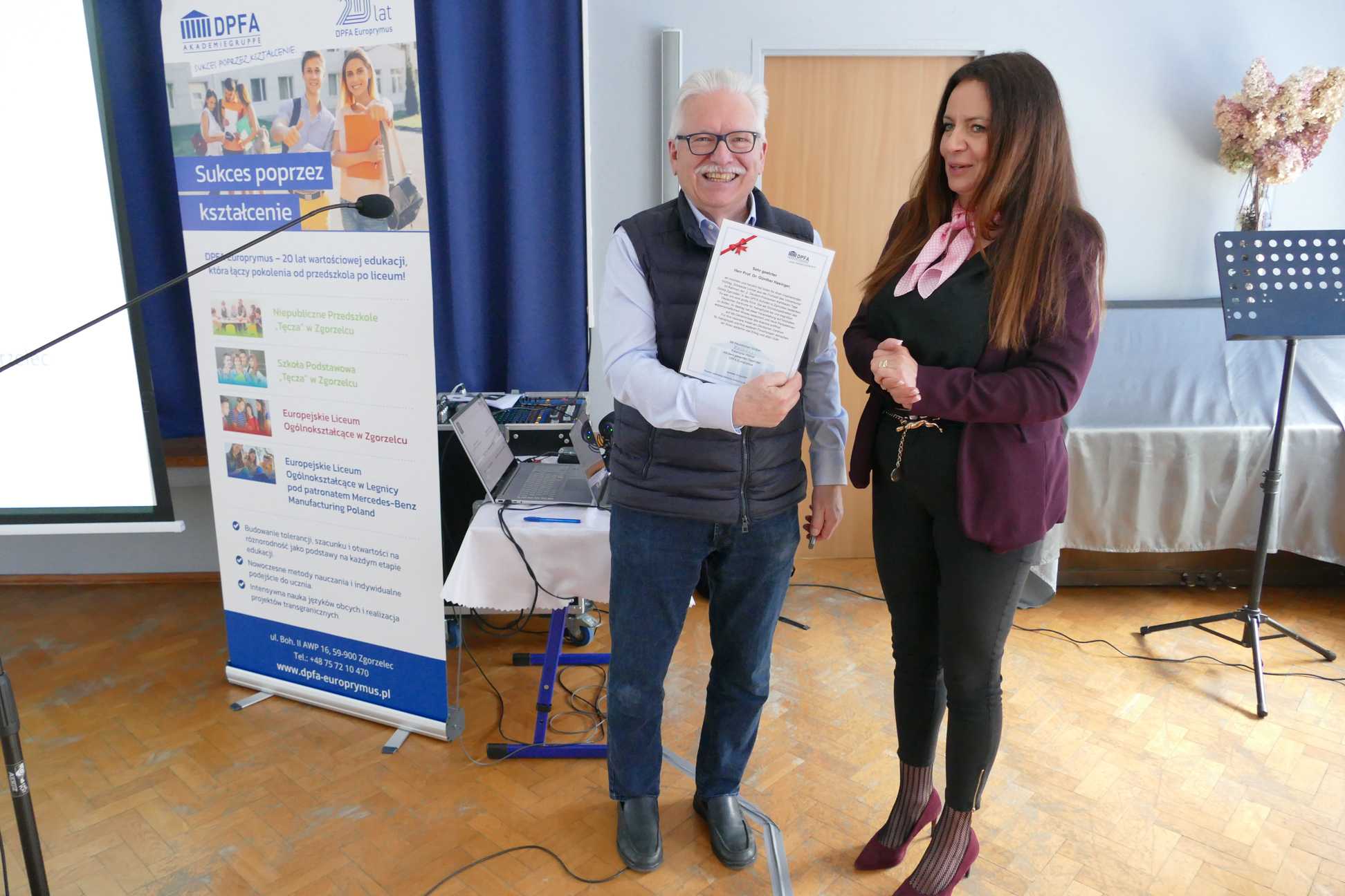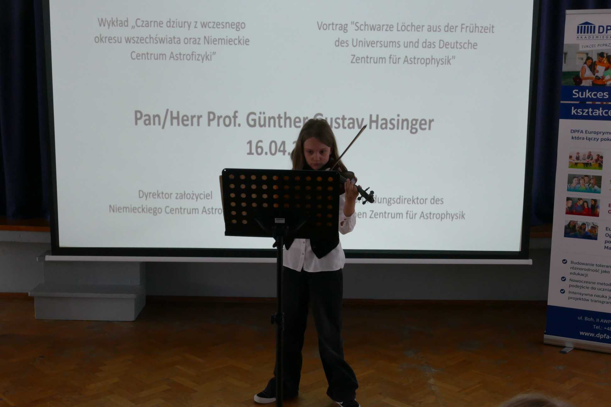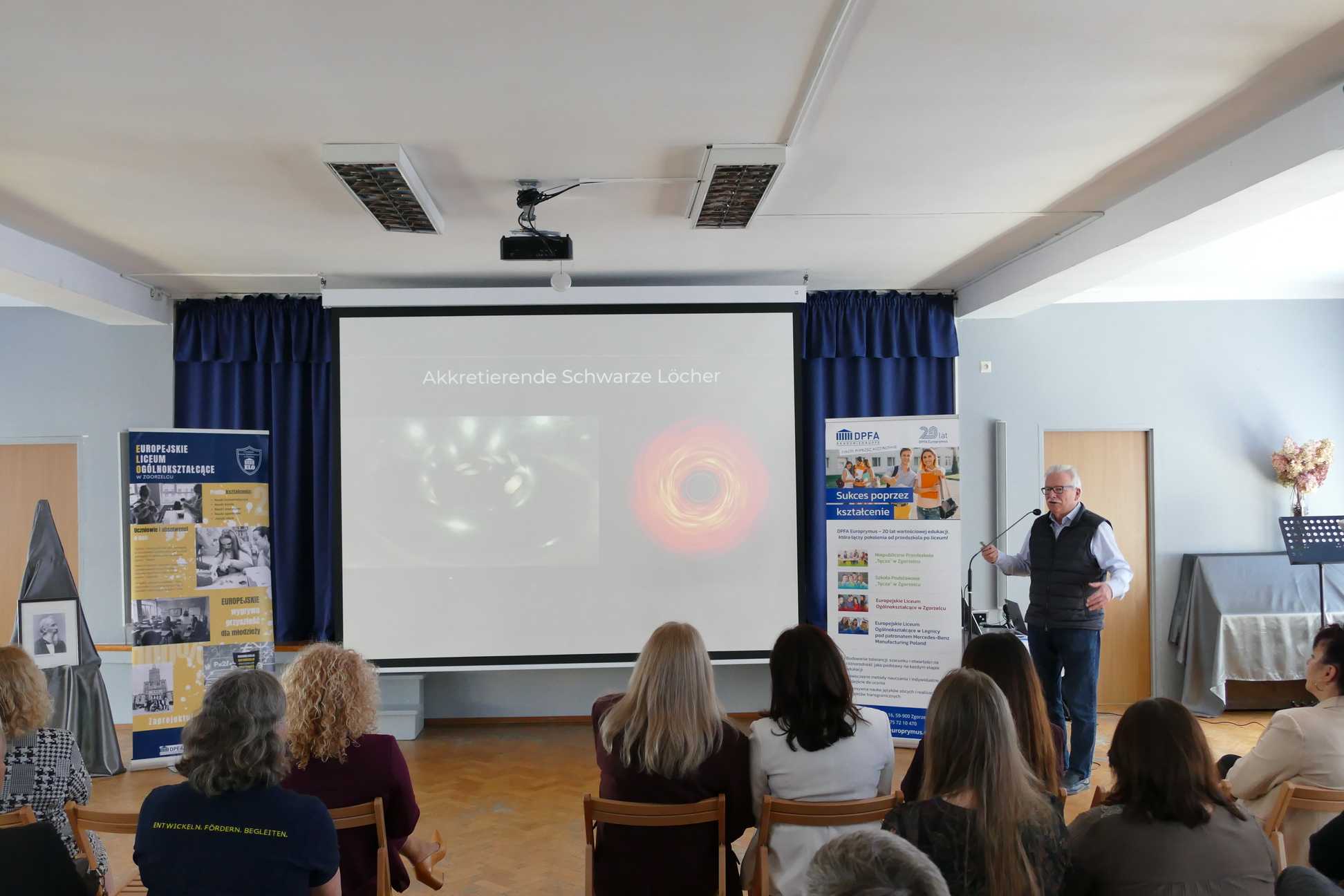 Spotkanie uroczyście rozpoczęły nasze uczennice, które swoim występem artystycznym wprowadziły wszystkich gości w wyjątkowy nastrój. Po części artystycznej oficjalnego powitania dokonała Katarzyna Hübner, Prezes DPFA Europrymus Sp. z o.o. Następnie odbył się główny punkt programu – fascynujący wykład prof. dr. Güntera Hasingera, dyrektora założyciela Niemieckiego Centrum Astrofizyki (DZA) w Görlitz. Profesor przybliżył zebranym tematykę czarnych dziur z wczesnego okresu wszechświata oraz przedstawił misję powstającego centrum astrofizyki.