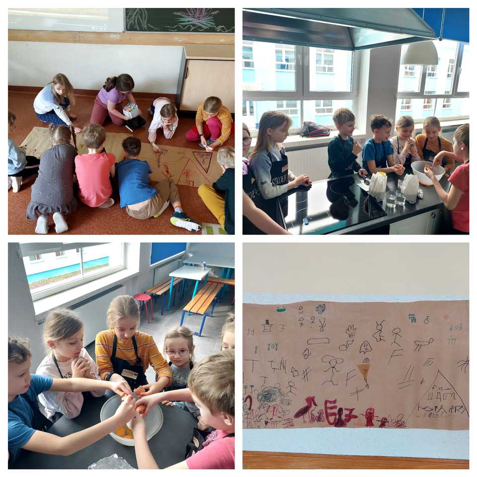 Środę na świetlicy spędziliśmy w temacie starożytności. Zagłębiliśmy się wesoło w świat starożytnych Egipcjan, a więc pisaliśmy hieroglifami, bawiliśmy się w mumie i piekliśmy pyszne babeczki.